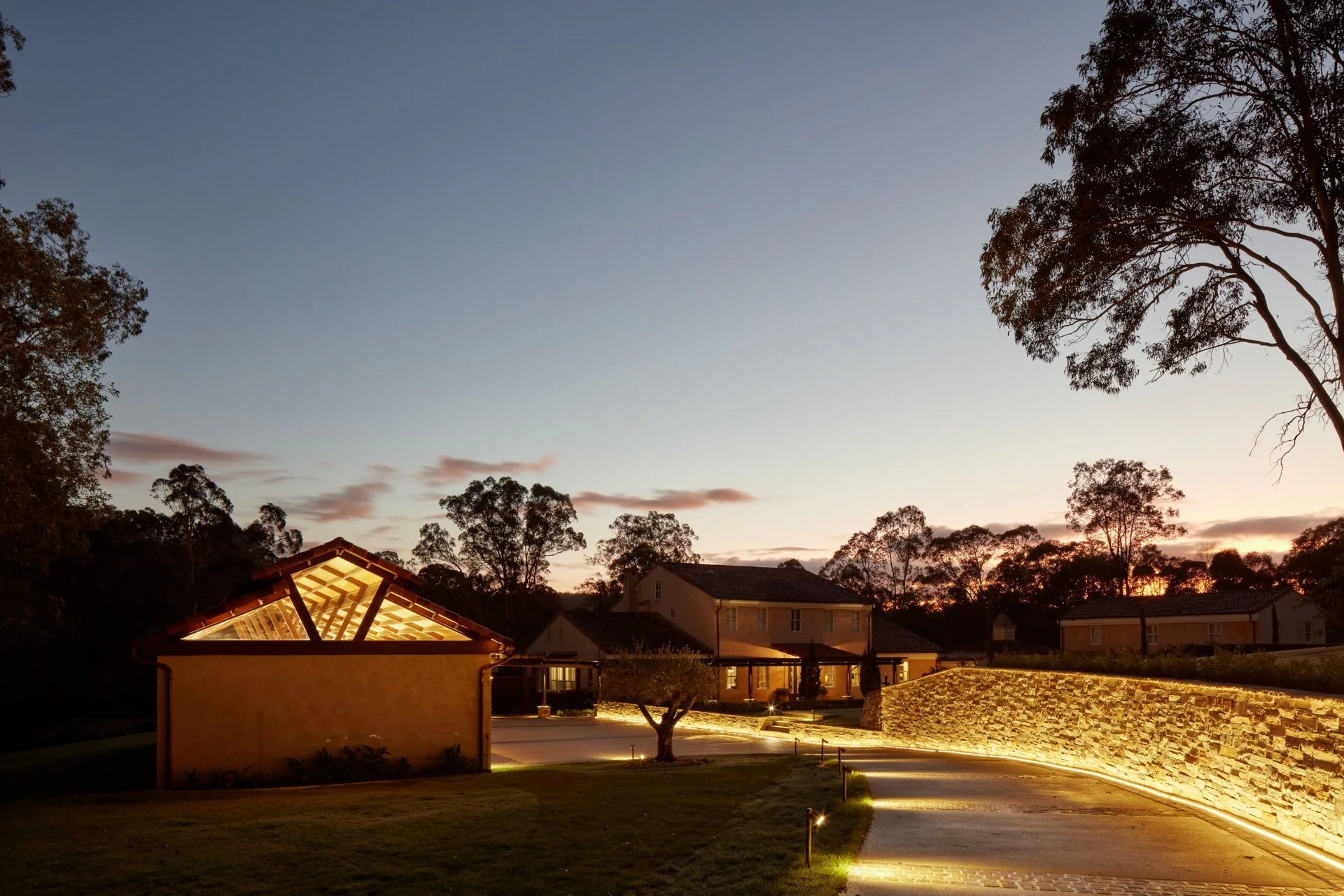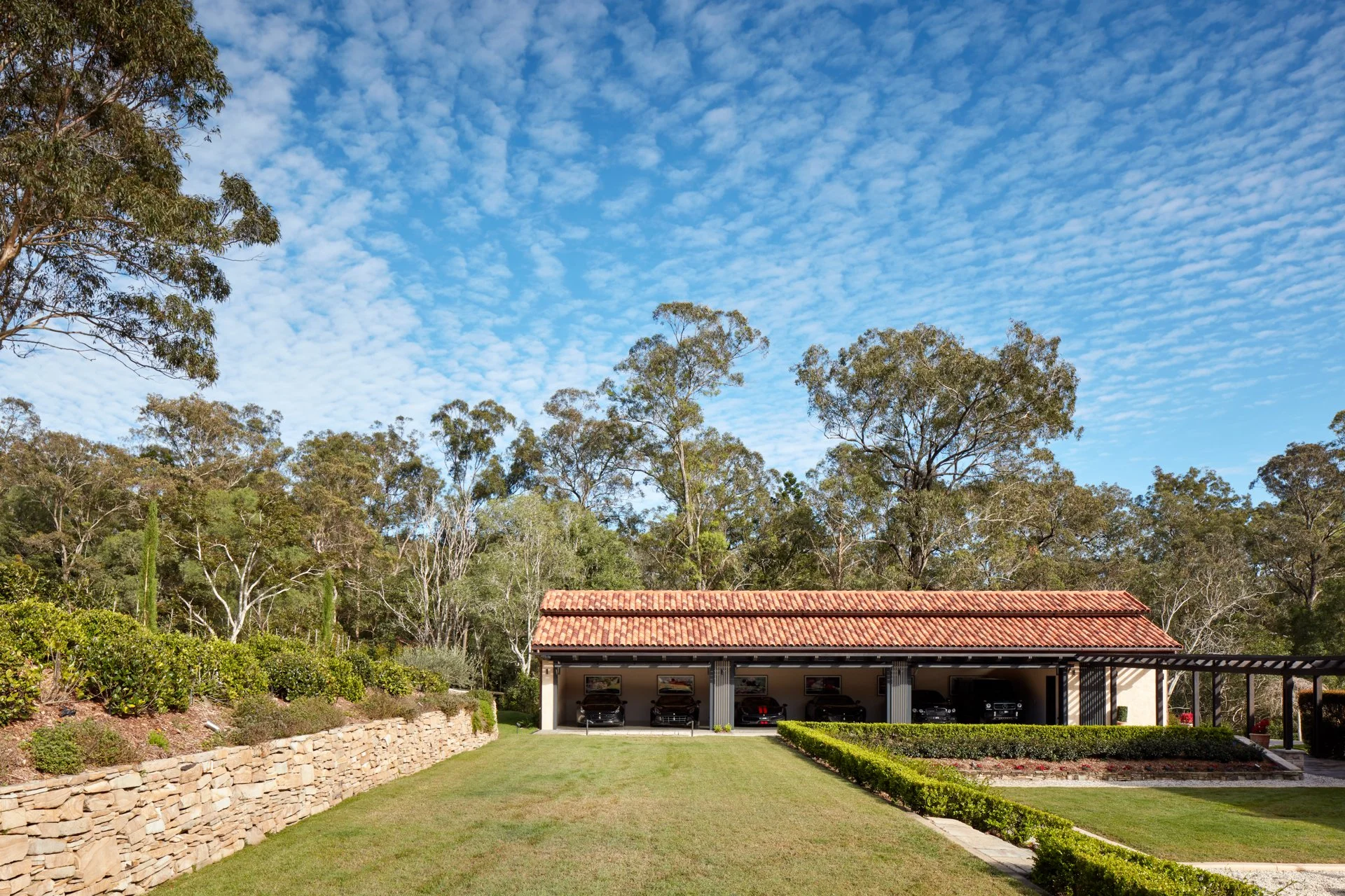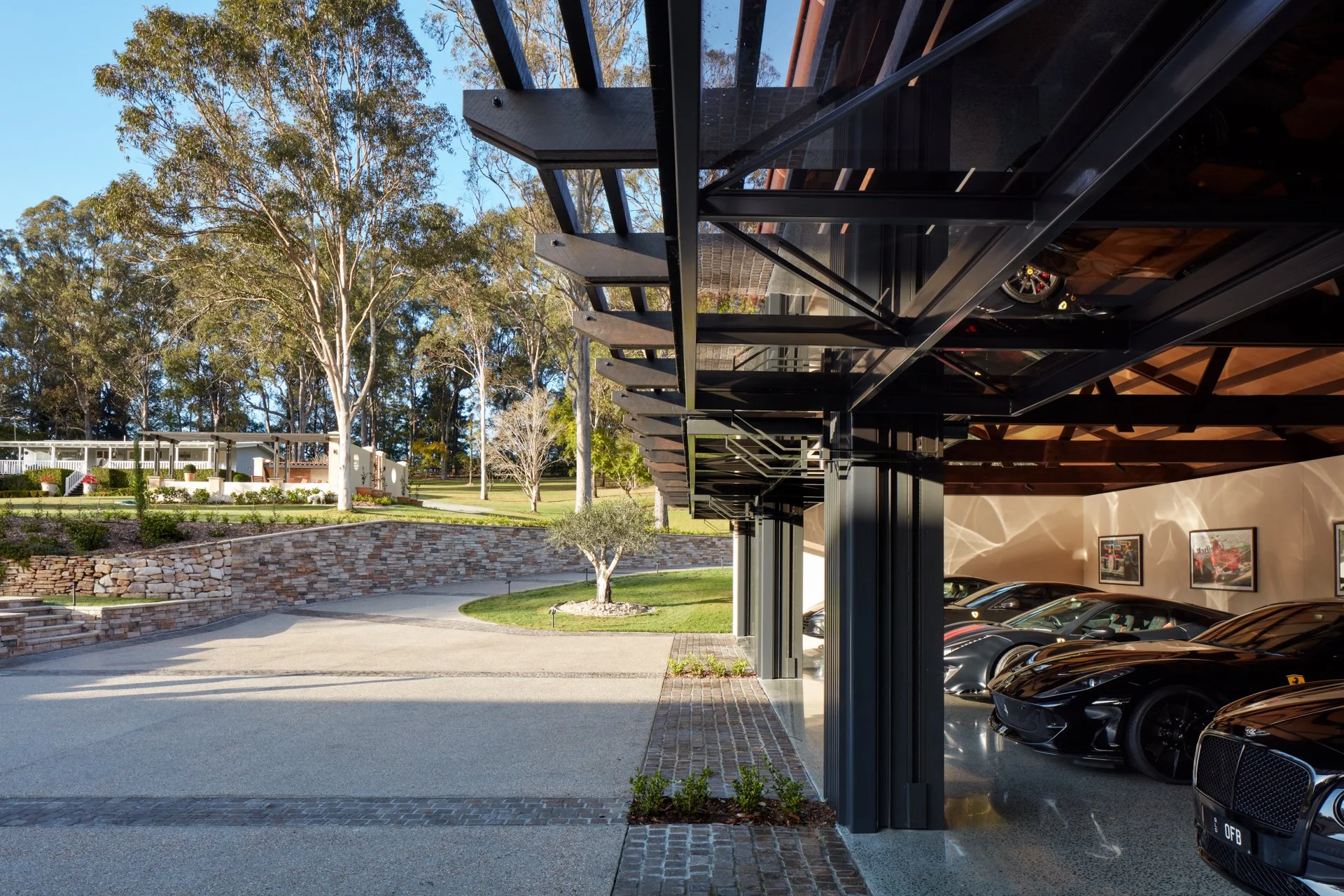 Part museum and part garage, the supercars are displayed in a suitably high-quality shed that nods deferentially to the rural setting. The vented Terracotta tile roof is sculpturally supported by steel and hardwood composite trusses that express the span and give the built form a volume reminiscent of farm stable construction. Beautifully engineered, counter-weight doors are glazed to best display the beauty of the vehicles being garaged.